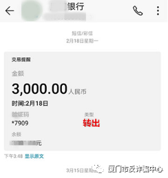 杨先生确实有一张该行的信用卡,于是杨先生拨打了短信里预留的“客服电话”。拨通后“客服”先询问了杨先生信用卡的信用额度,并称杨先生的信用卡现在已经被冻结了,要解冻的话杨先生必须向自己名下的一张银行卡存入与额度一致的钱款,以便“验证还款能力”。杨先生信以为真,赶紧向自己的储蓄卡转入了10000元,之后“客服”又称银行现在要验证杨先生账号的“安全性”,向杨先生索要了手机收到的短信验证码。在杨先生向对方报出验证码后不久,便收到了银行的扣款短信。