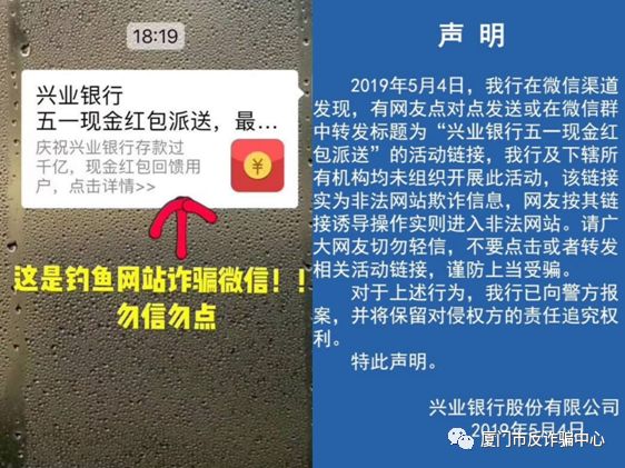 5月4日,一则“兴业银行五一现金红包派送”的链接出现在不少微信群及朋友圈内,兴业银行在及时发现了该情况后,立即通过官方发送了一则声明,并提醒网友不要点击或者转发,谨防上当受骗。至今,厦门并未接报该类诈骗警情。