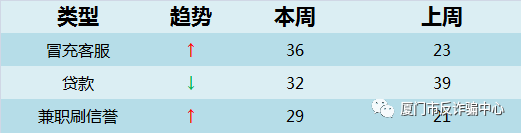 冒充客服36起、贷款32起、兼职刷信誉29起。