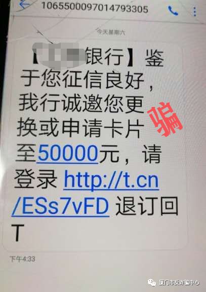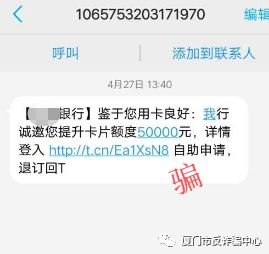 此类骗术,一般是“银行短信”或“银行电话”邀请持卡人提额。短信或电话内,骗子会告诉你,你的信用卡额度可以提升至xx元,然后让你按照他的要求操作(输入信用卡号码、验证码等等),等你输入完之后,意识到自己被骗时,一切都晚了。上周,包括小王在内,有一样遭遇的受害者一共有7人。